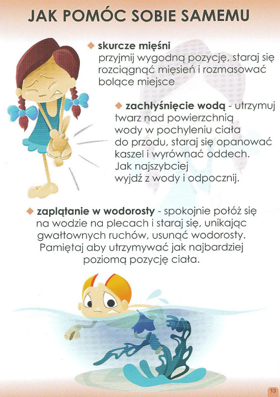 - podczas skurczu mięśni nie wpadać w panikę. Kiedy coś takiego nam się przydarzy starajmy się wezwać pomoc, jeśli jest ktoś w pobliżu. Jeśli nie ma nikogo takiego, należy położyć się na plecach, spokojnie oddychać, zgiąć stopę w stawie skokowym i mocno przyciągając ją do siebie wyprostować nogę w kolanie i starać się dopłynąć powoli do brzegu.
