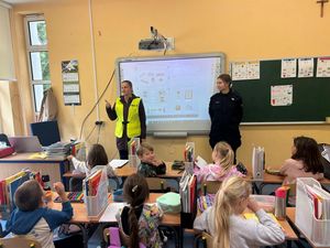 W ramach akcji „Bezpieczna droga do szkoły” policjantka z Zespołu Nieletnich wraz z nowo przyjętą funkcjonariuszką Komendy Powiatowej Policji w Trzebnicy odwiedziły Szkołę Podstawową w Krynicznie. Spotkanie skierowane było do uczniów klas pierwszych i poświęcone zasadom bezpiecznego poruszania się po drogach oraz ogólnemu bezpieczeństwu dzieci.