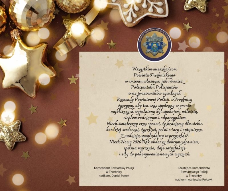 Z okazji Świat Bożego Narodzenia wszystkim mieszkańcom powiatu trzebnickiego w imieniu własnym, jak również Policjantek, Policjantów oraz pracowników cywilnych Komendy Powiatowej Policji w Trzebnicy życzymy, aby ten czas spędzony w gronie najbliższych wypełniony był spokojem, miłością, ciepłem rodzinnym i odpoczynkiem. Niech świąteczny czas sprawi, że będziemy dla siebie bardziej serdeczni, życzliwi, pełni wiary i optymizmu. Z nadzieją spoglądajmy w przyszłość. Niech Nowy 2026 Rok obdarzy dobrym zdrowiem, spełnia marzenia, daje satysfakcję i siły do pokonywania nowych wyzwań.