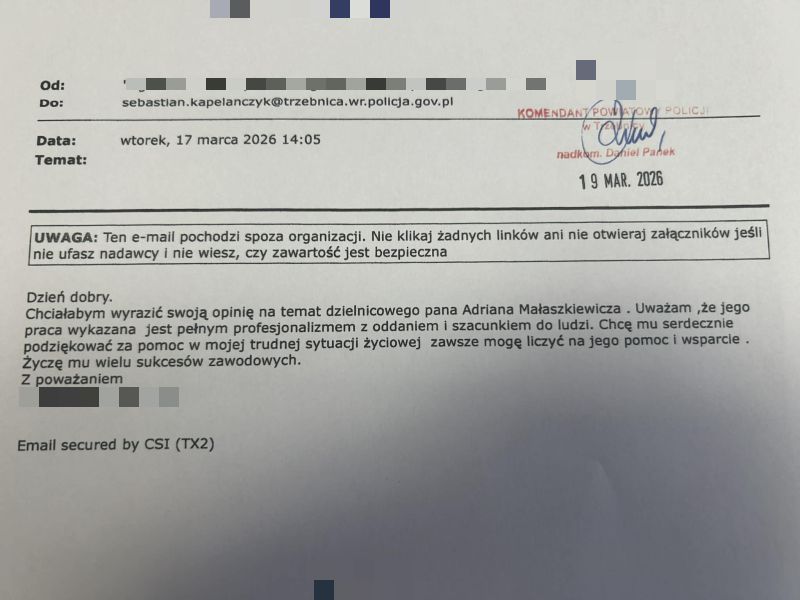 Każdego dnia policjanci podejmują działania na rzecz bezpieczeństwa mieszkańców, często pozostając w cieniu codziennych obowiązków. Tym bardziej cieszą słowa uznania, które są wyrazem wdzięczności za trud i zaangażowanie. Do Komendy Powiatowej Policji w Trzebnicy wpłynęły podziękowania dla dzielnicowego mł.asp. Adriana Małaszkiewicza, które pokazują, jak ważna jest bliska współpraca Policji ze społeczeństwem.